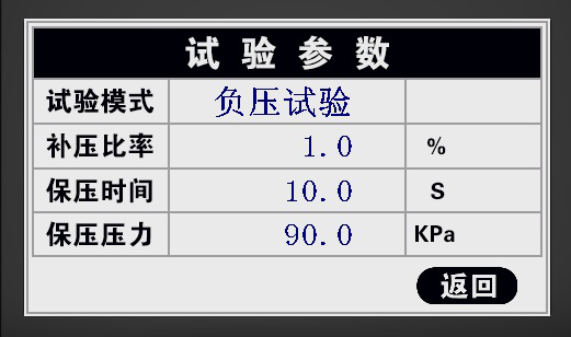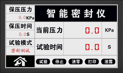 3: 進入試驗界面,界面上顯示的“當前壓力”為當前的試驗壓力;“試驗時間”為試驗過程中的保壓時間;“保壓壓力”為設置的壓力,“保壓時間”為設置的保壓時間。當真空室內的壓力被抽到設定的保壓壓力時,開始保壓,并計保壓時間;“試驗模式”是密封測試。